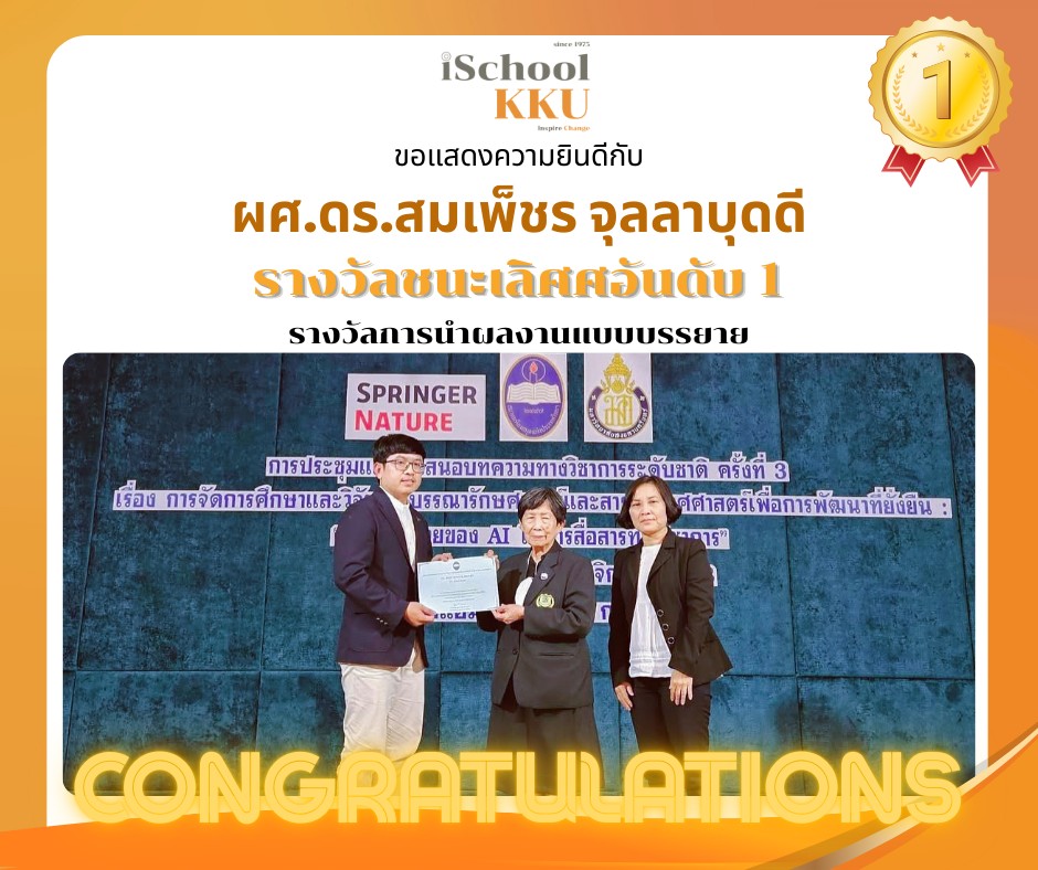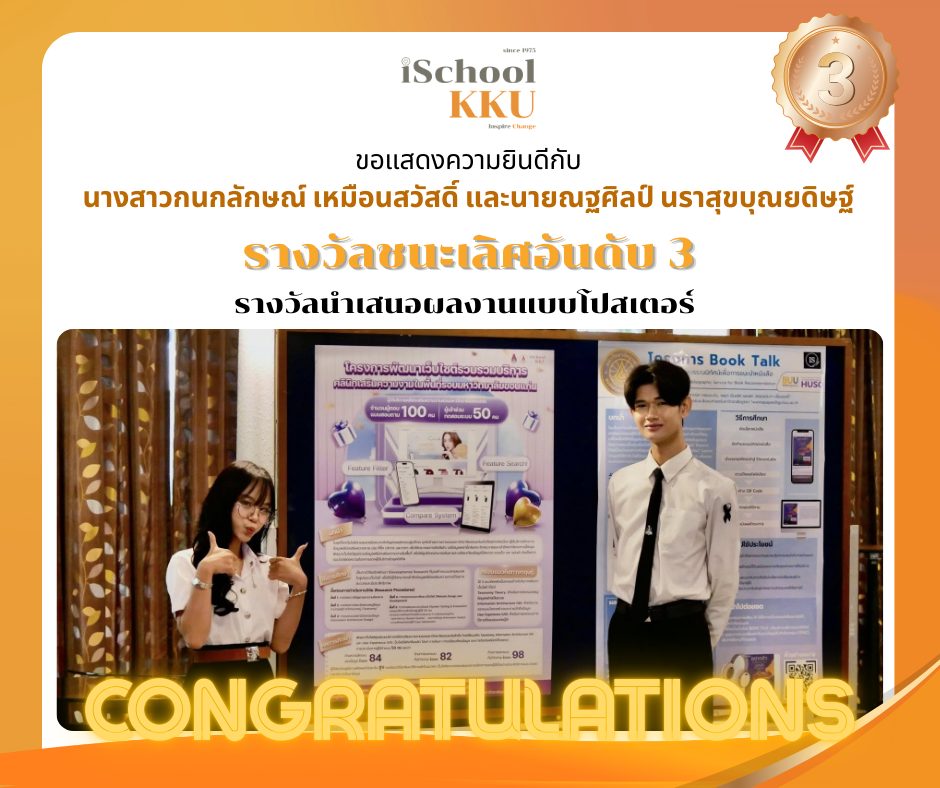 หลักสูตรสารสนเทศศาสตรบัณฑิต (BiS) สาขาวิชาสารสนเทศศาสตร์ (iSchool KKU) คณะมนุษยศาสตร์และสังคมศาสตร์ มหาวิทยาลัยขอนแก่น สร้างความภาคภูมิใจอีกครั้ง ด้วยการคว้า 3 รางวัล จากการประชุมวิชาการระดับชาติ ครั้งที่ 3 เรื่อง “การจัดการศึกษาและวิจัยทางบรรณารักษศาสตร์และสารสนเทศศาสตร์เพื่อการพัฒนาที่ยั่งยืน” ซึ่งจัดโดย สมาคมห้องสมุดแห่งประเทศไทย ในพระราชูปถัมภ์ฯ ระหว่างวันที่ 27–28 พฤศจิกายน 2568 ณ โรงแรมแอมบาสซาเดอร์ สุขุมวิท 11 กรุงเทพมหานคร
