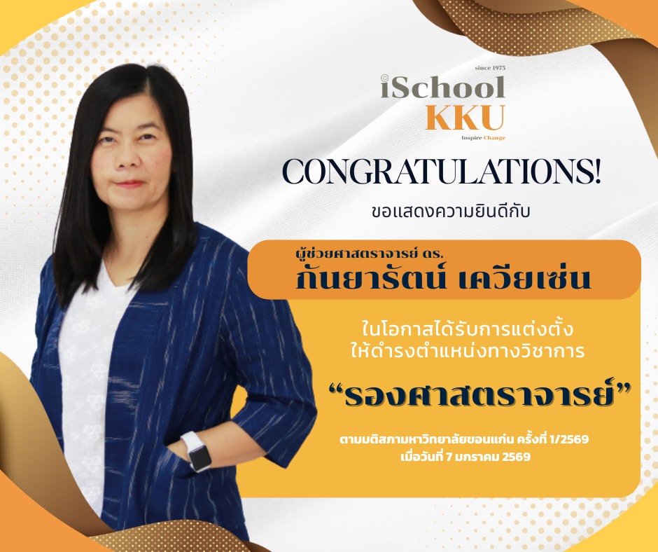 iSchoolKKU ขอร่วมแสดงความชื่นชมและยินดีเป็นอย่างยิ่ง พร้อมขออำนวยพรให้ท่านประสบความสำเร็จยิ่งขึ้นในเส้นทางวิชาการ และเป็นพลังสำคัญในการขับเคลื่อนงานด้านการศึกษาและการวิจัยของสถาบันและของประเทศต่อไป