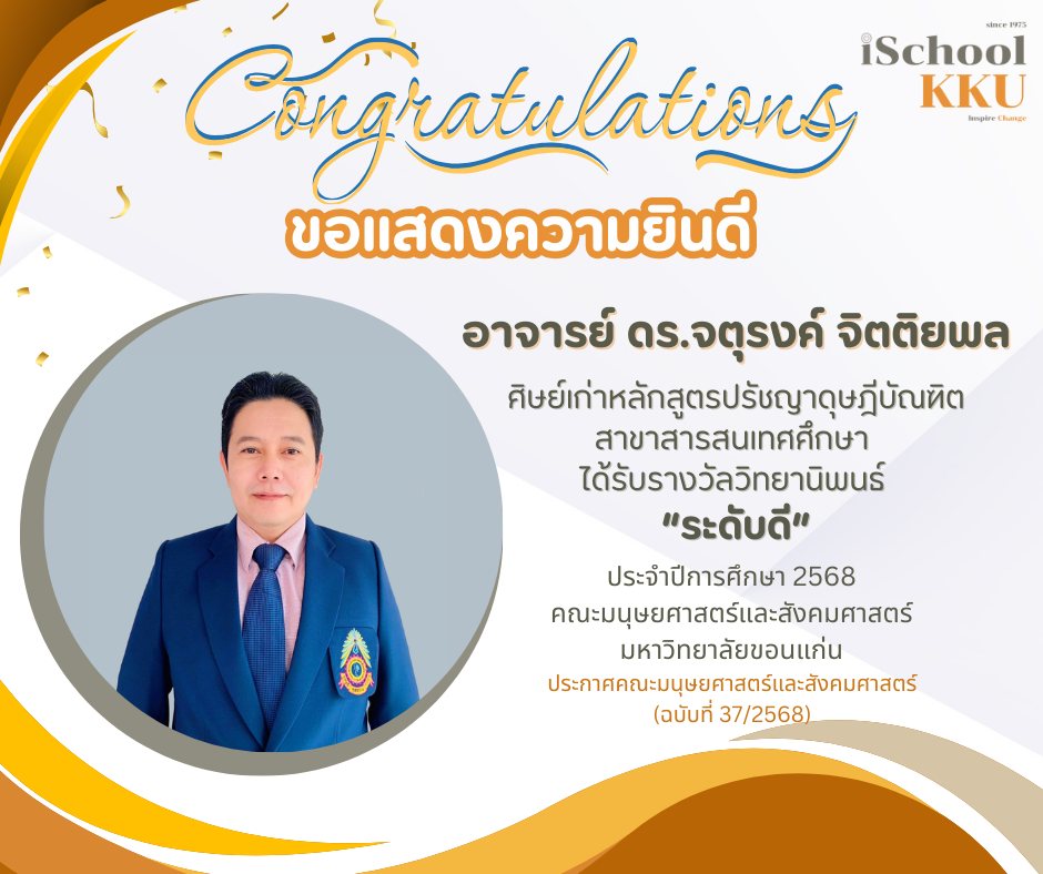 ขอแสดงความยินดีกับ ศิษย์เก่า iSchoolKKU ที่สร้างชื่อเสียงทางวิชาการ ด้วยการได้รับ รางวัลวิทยานิพนธ์ ประจำปีการศึกษา 2568 และเข้ารับรางวัลในงาน The 20th International Conference on Humanities and Social Sciences (IC-HUSO 20th ) เมื่อวันที่ 8 มกราคม 2569 ณ Pullman Khon Kaen Raja Orchid