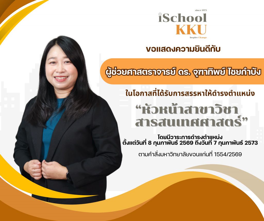 หลักสูตรสารสนเทศศาสตร์ iSchoolKKU คณะมนุษยศาสตร์และสังคมศาสตร์ มหาวิทยาลัยขอนแก่น ขอแสดงความยินดีกับ ผู้ช่วยศาสตราจารย์ ดร.จุฑาทิพย์ ไชยกำบัง ในโอกาสที่ได้รับการสรรหาให้ดำรงตำแหน่ง หัวหน้าสาขาวิชาสารสนเทศศาสตร์